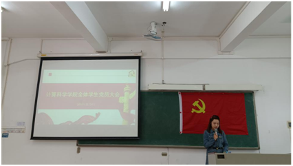 为进一步巩固学生党支部的攻坚堡垒作用,加强学生党员学习习总书记讲话的重要精神的自觉性,2020年11月4日,计算科学学院学生党支部组织全体学生党员于杨楼303召开党员大会,与会参与人员主要有党总支副书记郭肖明、辅导员张素雅、辅导员廖蕃及全体学生党员。