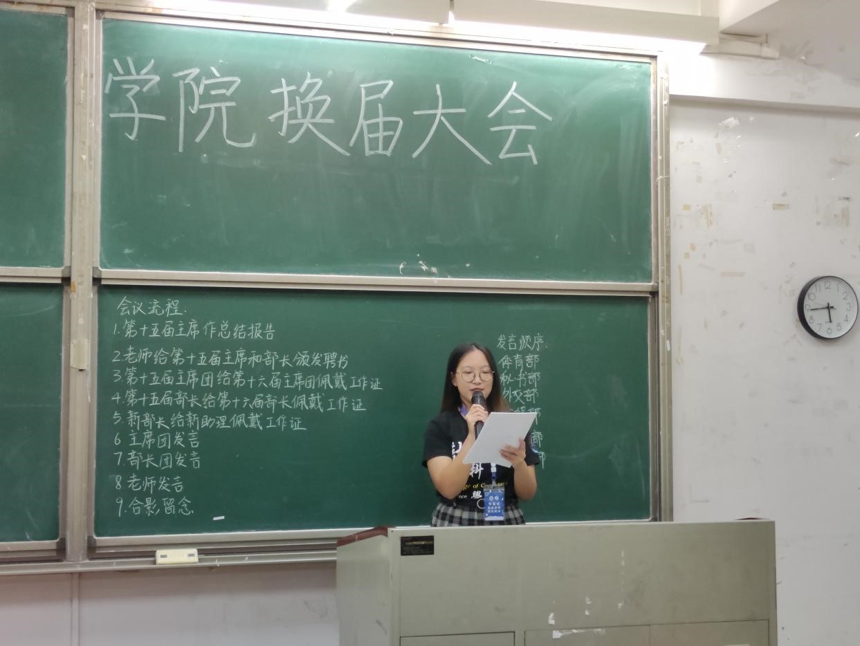 会议开始,上届院学生会主席叶佩贤同学上台发言,她对近期的活动进行总结,要求部门内部和部门之间加强沟通,在开展活动过程中要相互协助、互相补位,希望院学生会越来越好。