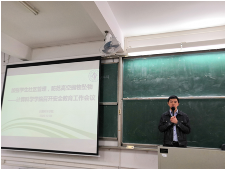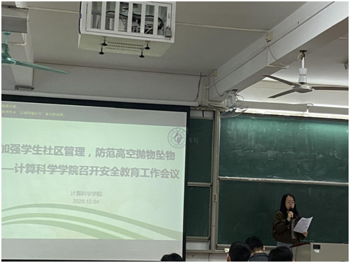 12月4日中午,计算科学学院在杨104室召开安全教育工作会议。本次会议的主题为“加强学生社区管理,防范高空抛物坠物”,参加本次会议的主要有辅导员廖蕃和张素雅、各班班委代表等。会议由张素雅主持。