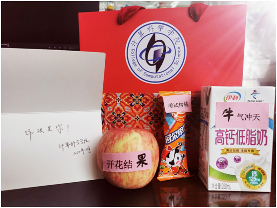 为了缓解2021届考研学生的压力,学院为考研学生准备了幸运盲盒,里面包括为考研学生加油打气的贺卡、棒棒糖“属你最棒”、牛奶“牛气冲天”和苹果“开花结果”。