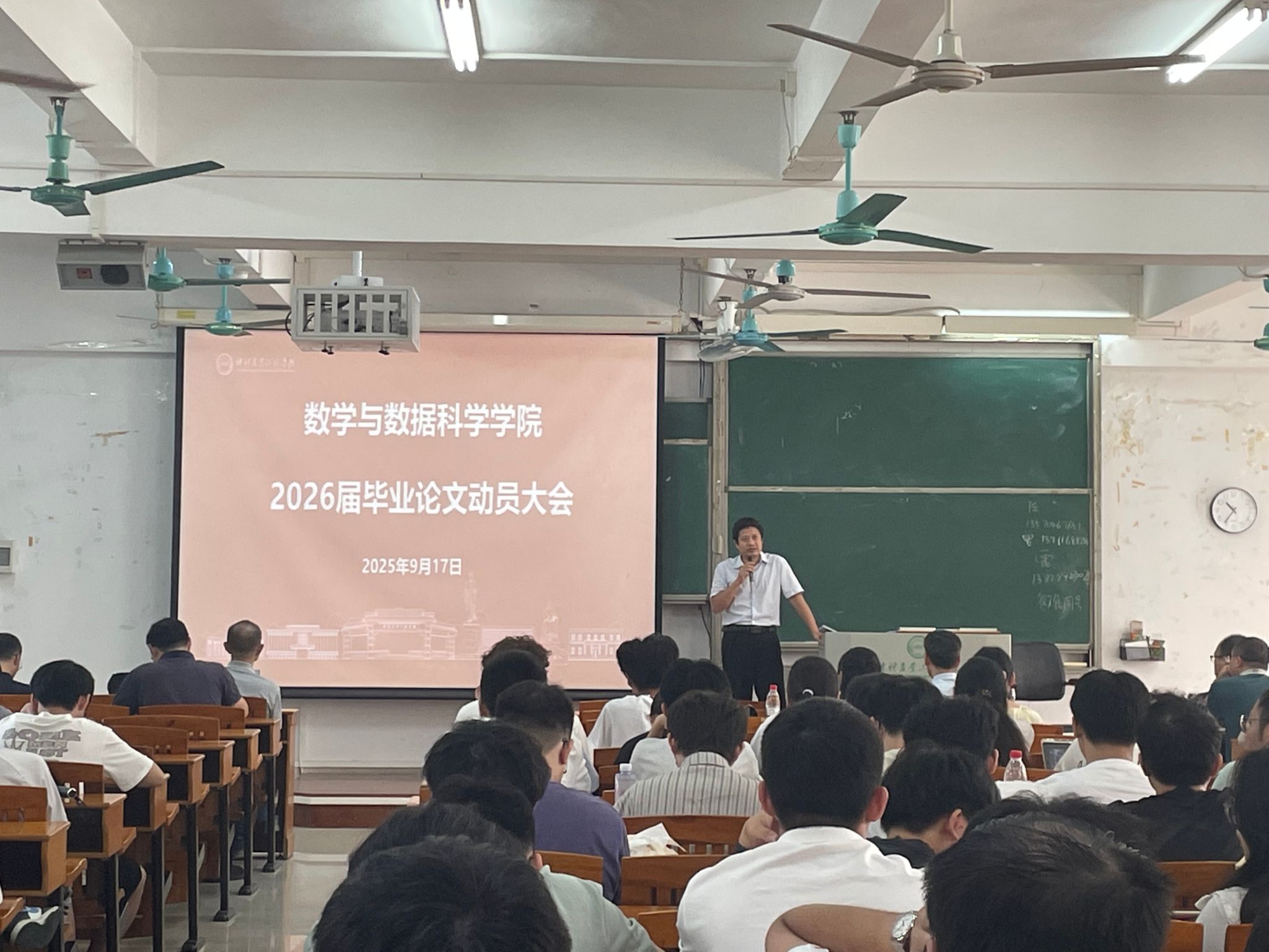 为扎实推进2026届本科生毕业论文工作,强化学术规范意识,提升论文撰写质量,明确各阶段任务与要求,数学与数据科学学院于9月17日召开2026届本科生毕业论文动员大会,学院领导班子、系主任、论文指导老师以及2026届全体毕业生参加了此次大会。会议由信息与计算科学系主任王前主持。