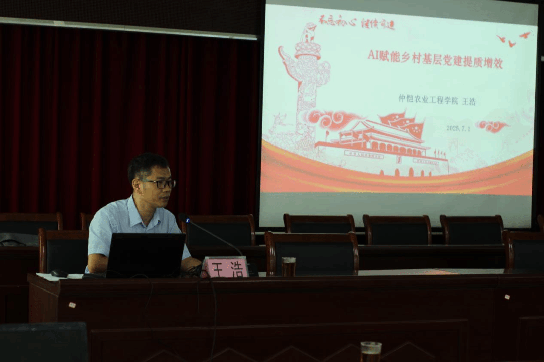 7 月 1 日,在中国共产党成立 104 周年之际,仲恺农业工程学院数学与数据科学学院积极响应“双百行动”,为英德市青塘镇村镇干部带来了一场别开生面的党课。此次党课由学院书记主讲,主题为《AI 赋能乡村基层党建提质增效》,助力推进人工智能全社会通识教育,提升村镇基层党务工作者的业务能力。党课由青塘镇邓伟志镇长主持。