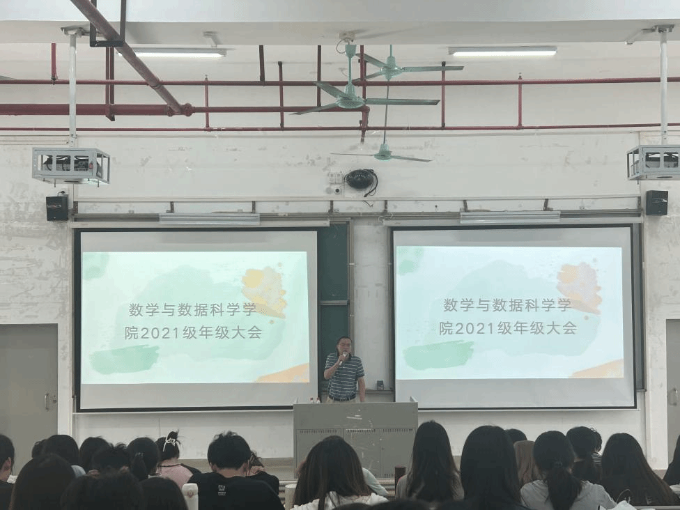 5月17日,数学与数据科学学院在D2教室召开2021级年级大会。参加会议的有学院党委副书记余应坤、辅导员解廷鑫以及2021级全体学生。